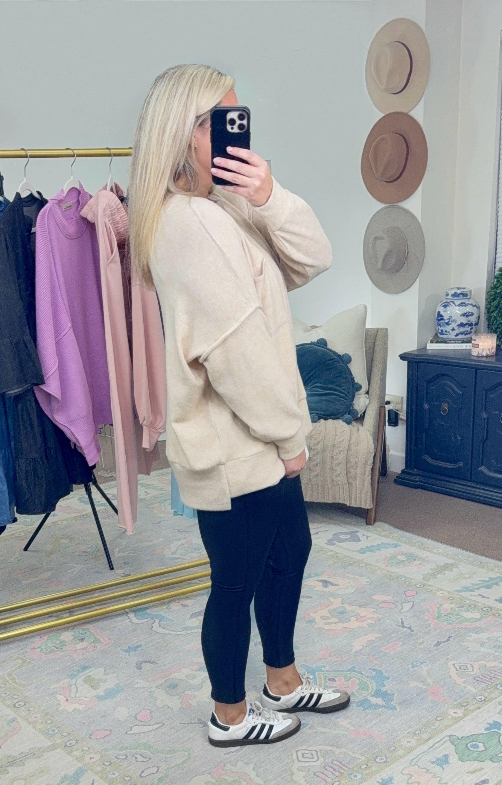 Donning a soft-to-the-touch brushed knit fabric, single pocket top features long dolman sleeves with an oversized tunic length that covers the front/back, an exposed seam and stretch all over.