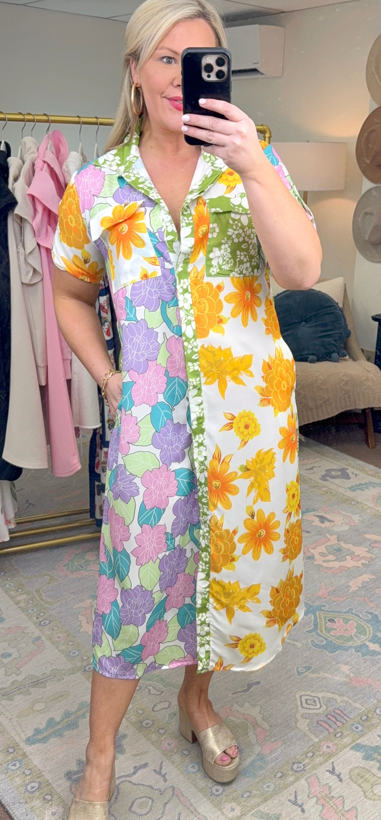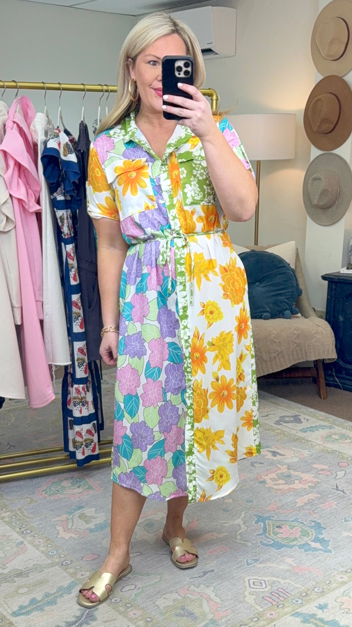 Donning vibrant hues and lightweight 100% woven material, dress features a flowy, shirt dress silhouette with a classic collared neckline, functioning covered buttons, double breast pockets, removable tie sash and pockets at the skirt.