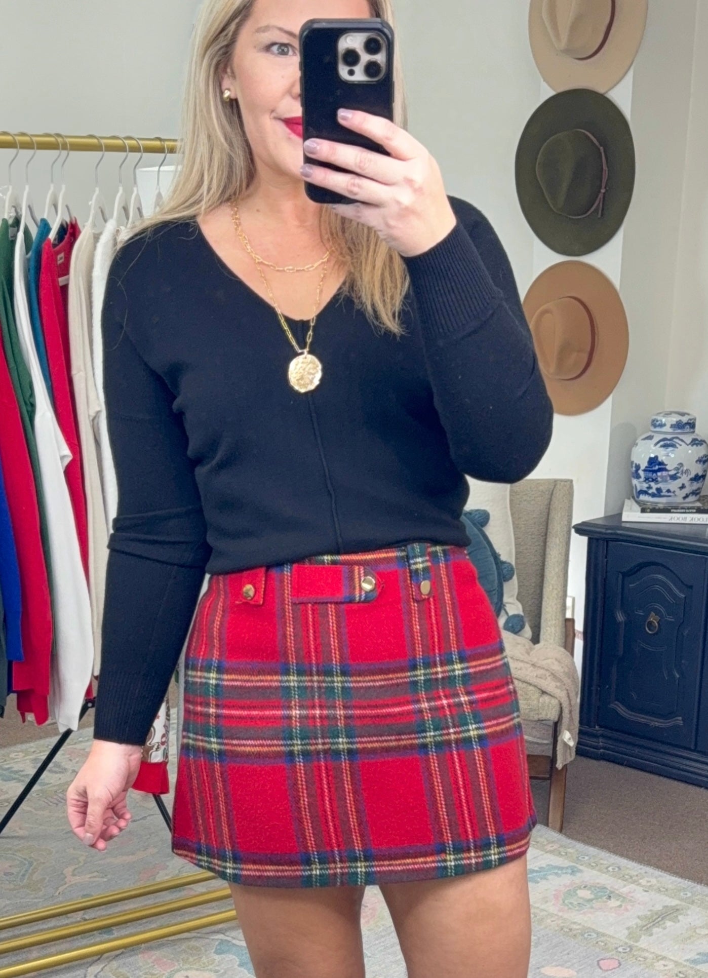 The red checkered plaid keeps it perfectly holiday-ready, while the belt loops and back zipper add a polished finish. Style it playful with a themed sweater or keep it timeless with a chunky knit and boots—either way, it’s picture-perfect for family gatherings and parties alike.