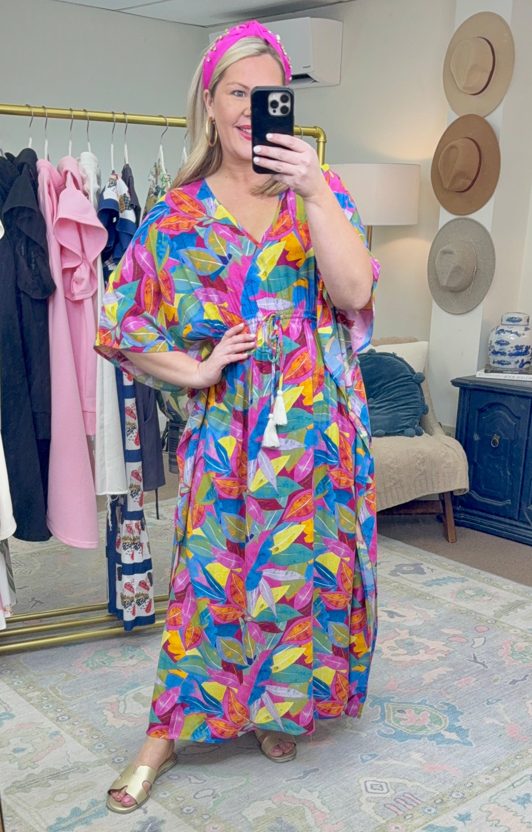 This flowy number hits in ALL the right places— from the strategically draped batwing sleeve bodice and the V front neckline to the cinched, elastic natural waist and the flowy skirt.