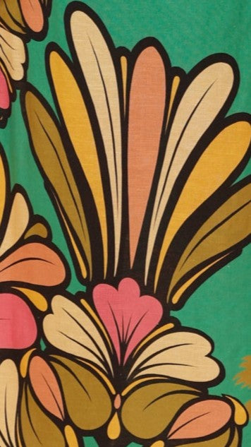 Featuring a striking mix of bold, colorful patterns inspired by tropical and floral motifs, the design incorporates shades of green, orange, pink, and black. Dress has an invisible side zip and is made of a lightweight, woven material, containing no stretch.