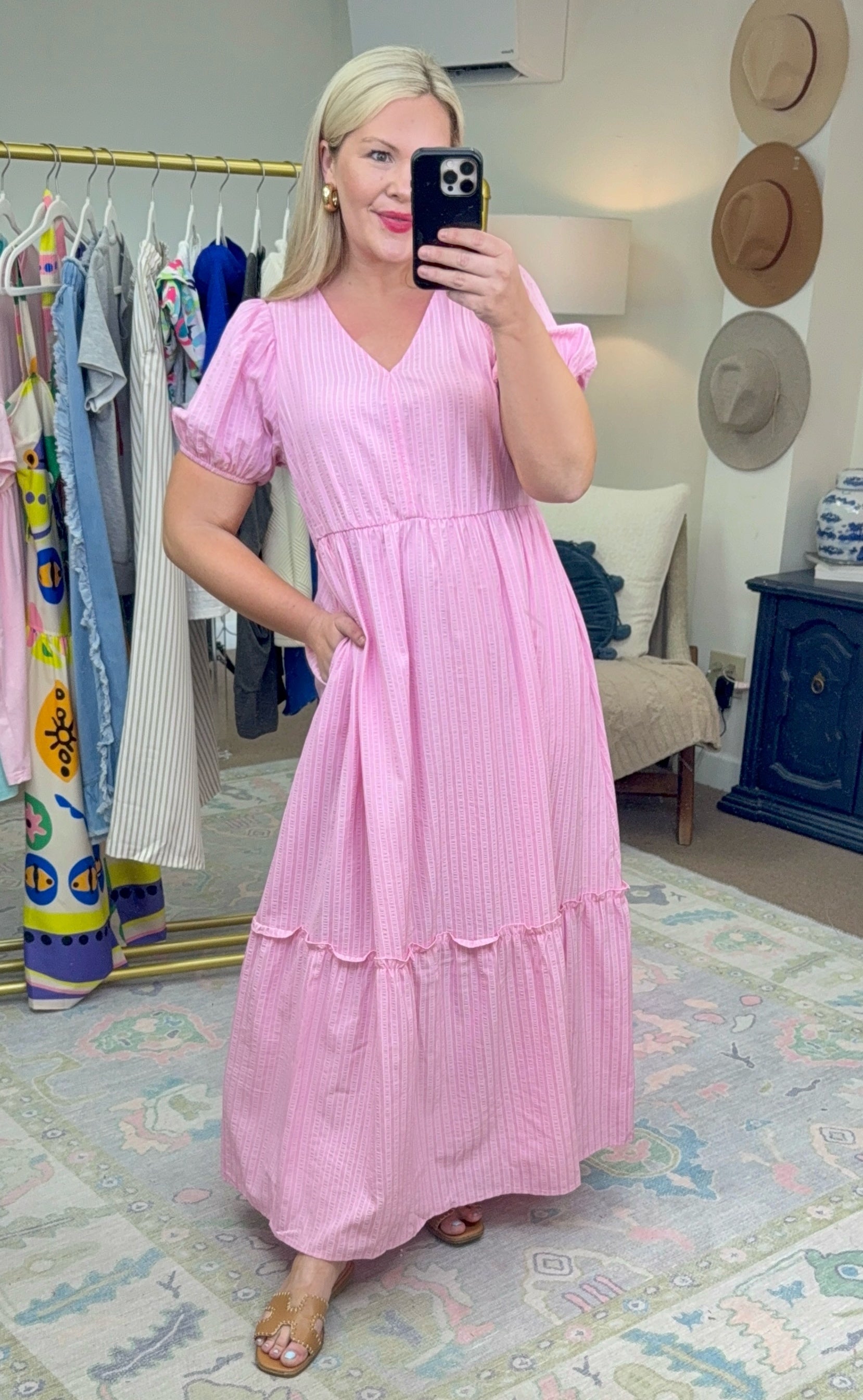 Crafted from a lightweight and textured seersucker material, maxi dress features a soft pastel hue with a notched V neckline, ruffle trim, dramatic puff sleeves and a relaxed, flowy silhouette. The cinched waist transitions to an A-line skirt with pockets.