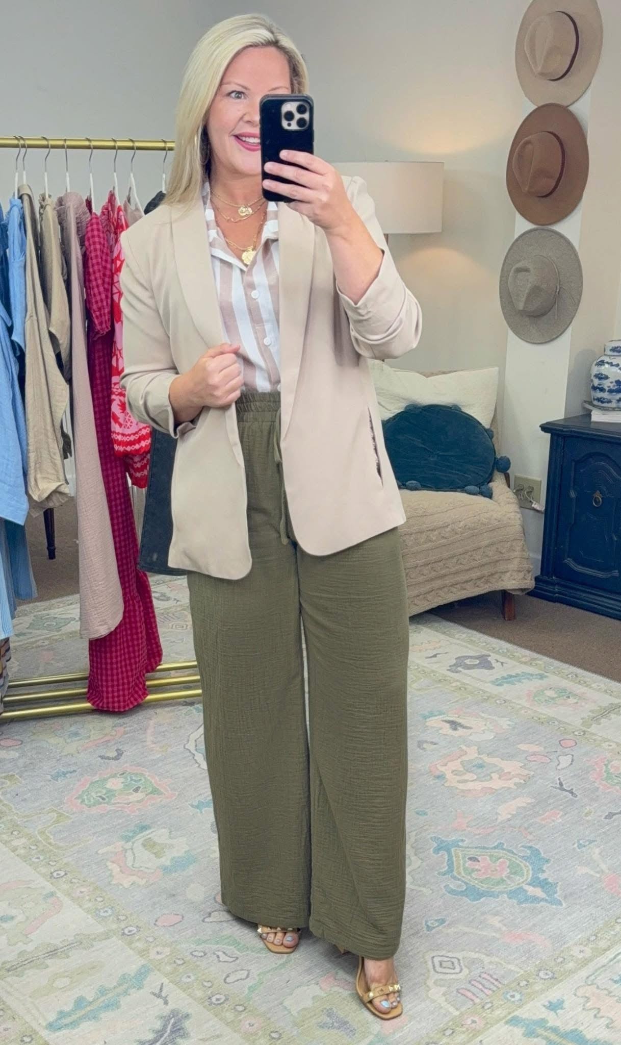 This boyfriend blazer has a slight oversized look to it. The sleeves are ruched (gives the perfect pushed up sleeve look) and the silhouette is slouchy but structured. This one will go with so much as the colors are neutral and super versatile.