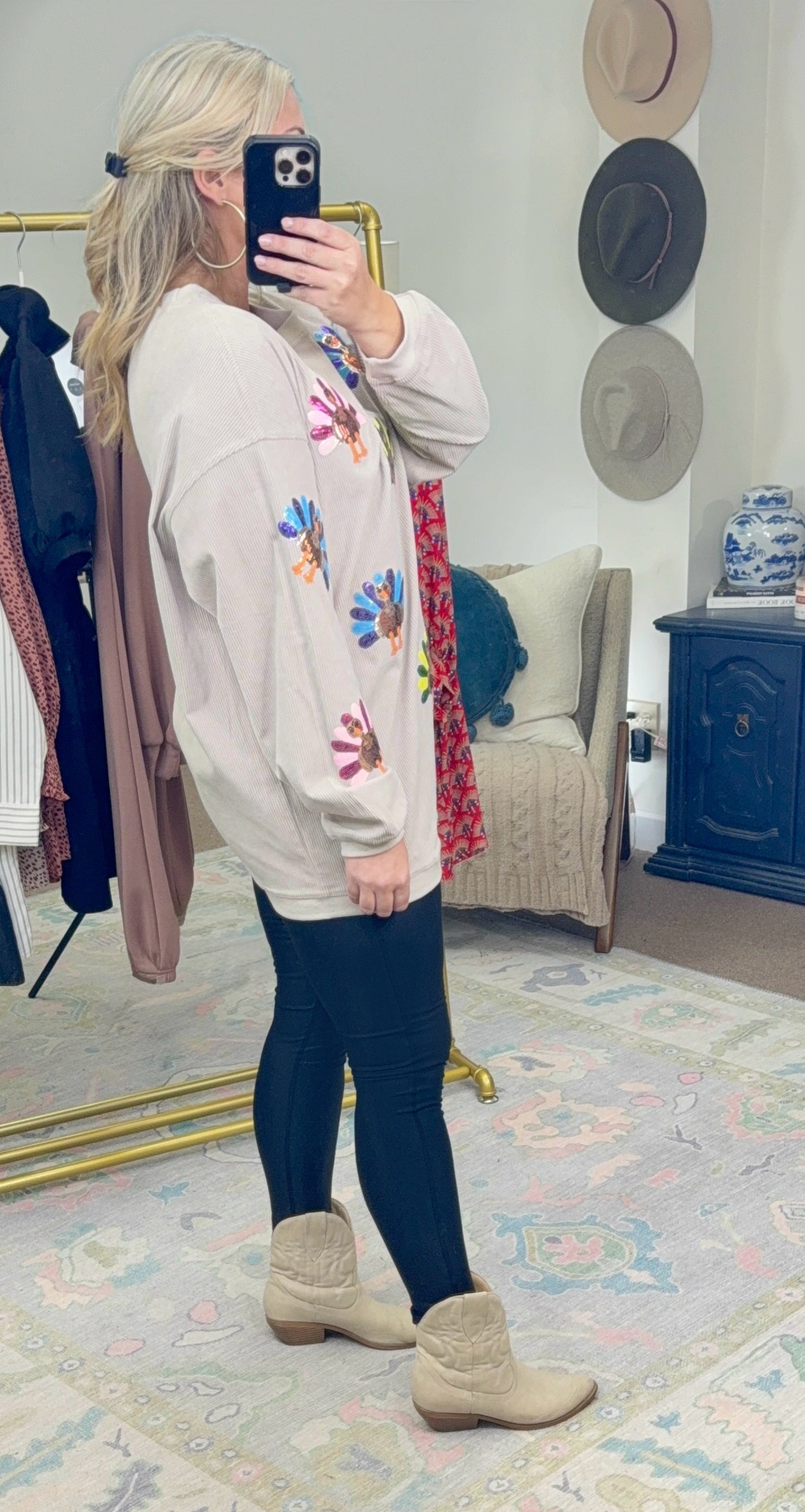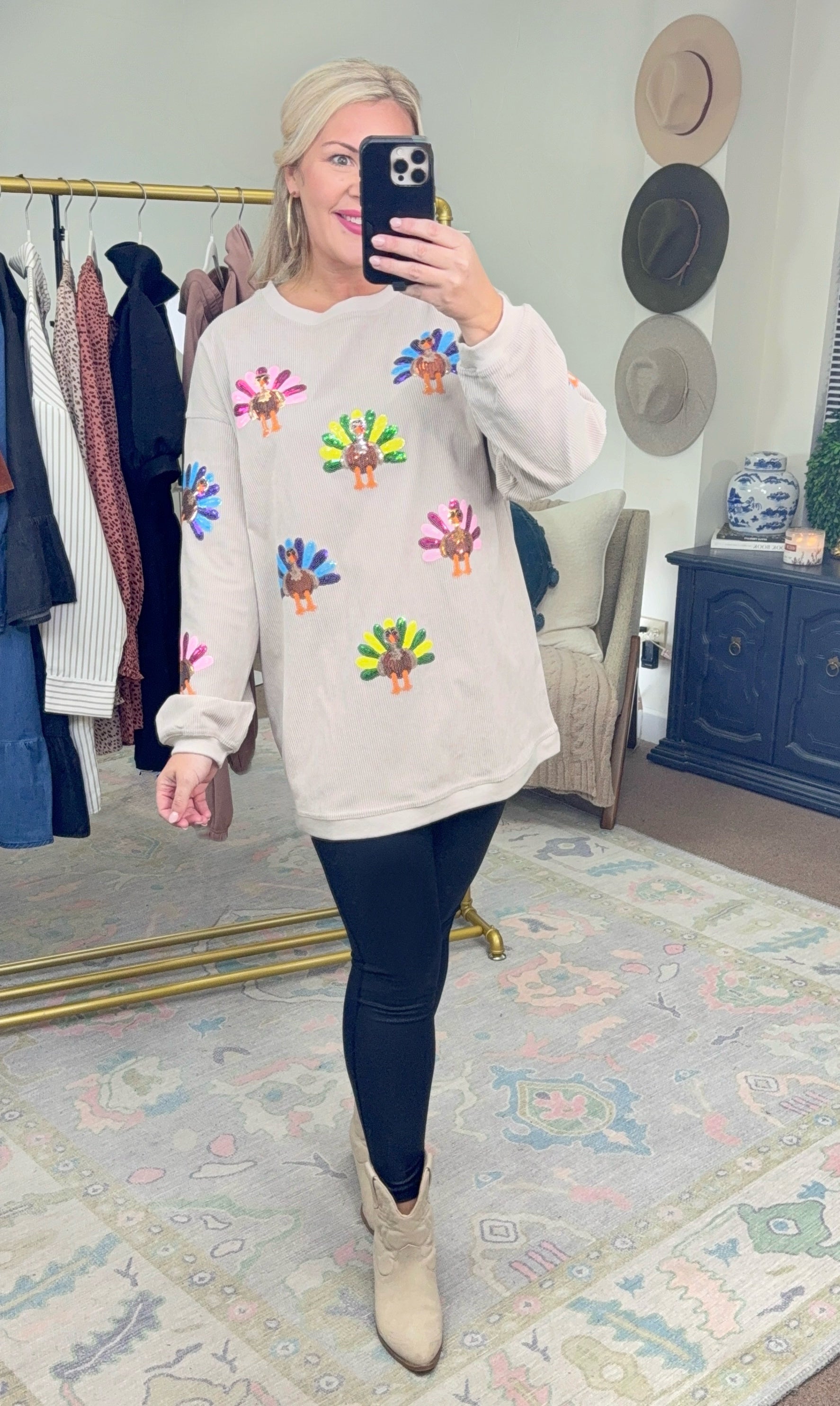 Shake Your Tail Feather Sequin Turkey Pullover Top