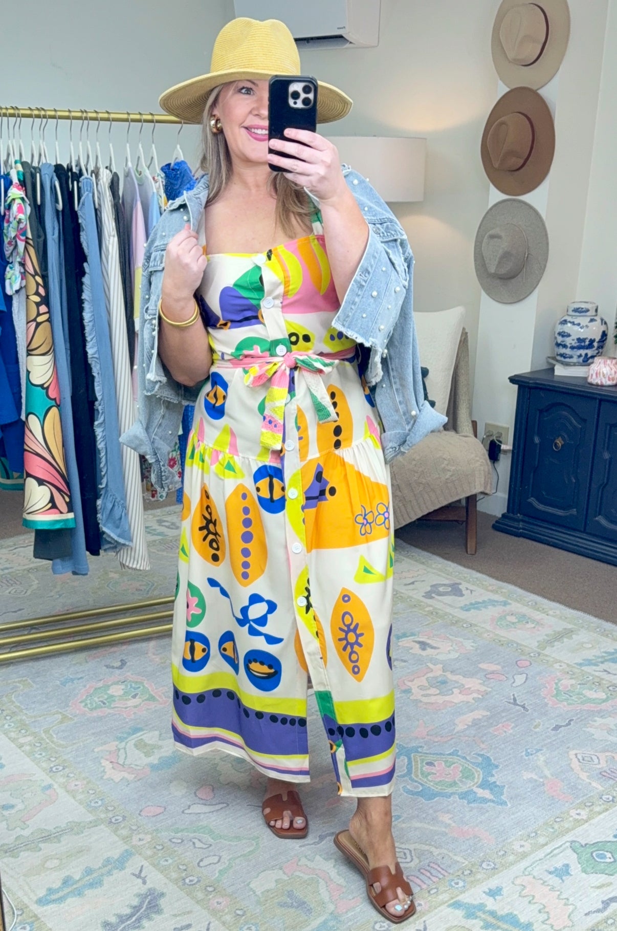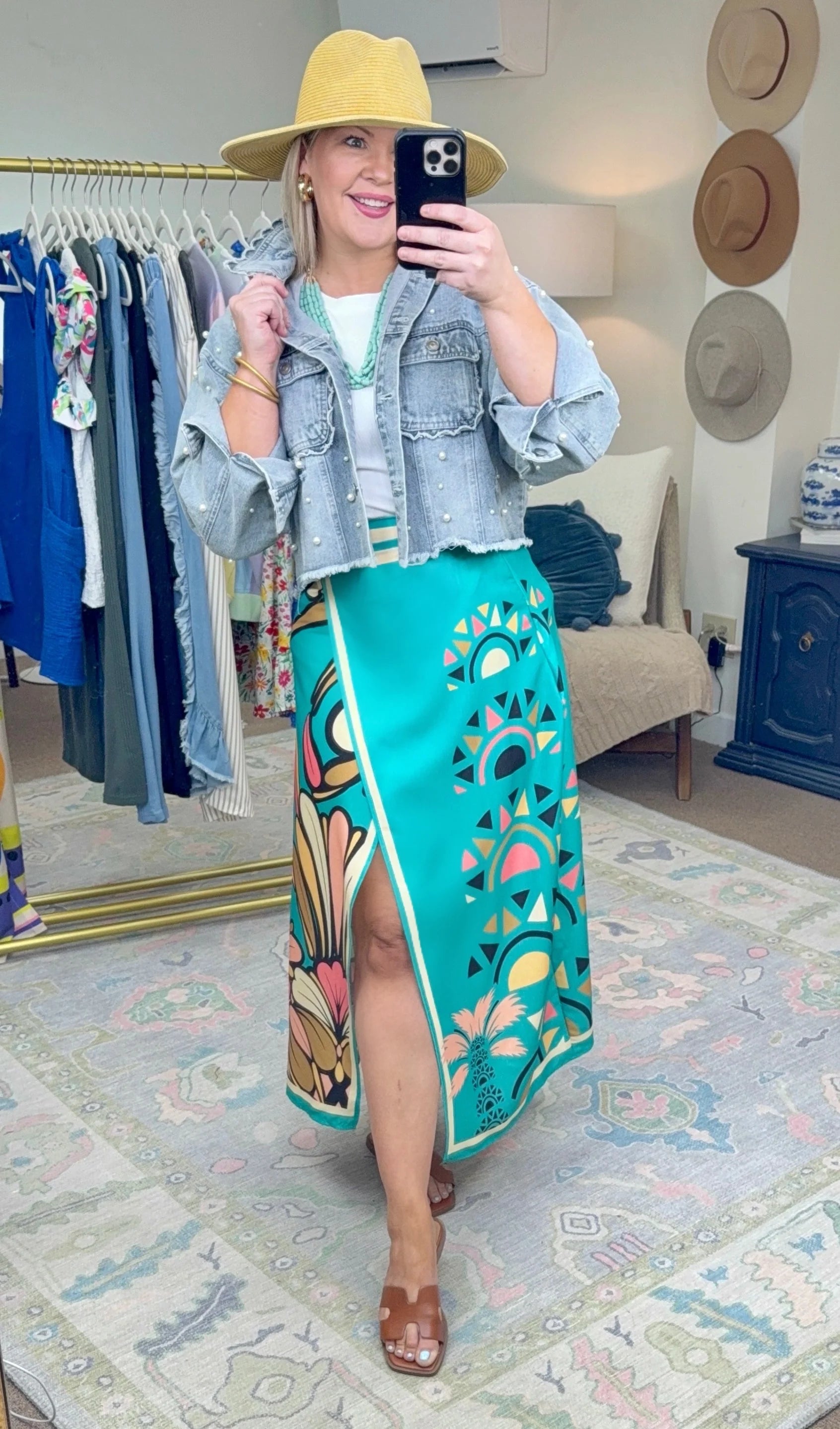 Donned with inteicate hand-sewn pearl details throughout, it’s got an oversized, slouchy fit, frayed edge hem, double breast pockets and a button down closure. These scallop hem throughout adds the sweetest touch.