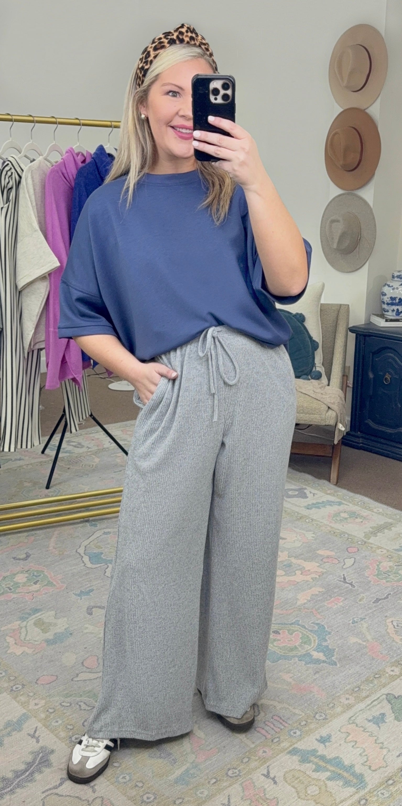 The fit is slightly oversized. Jamie is a size 8 & wears the S/M.