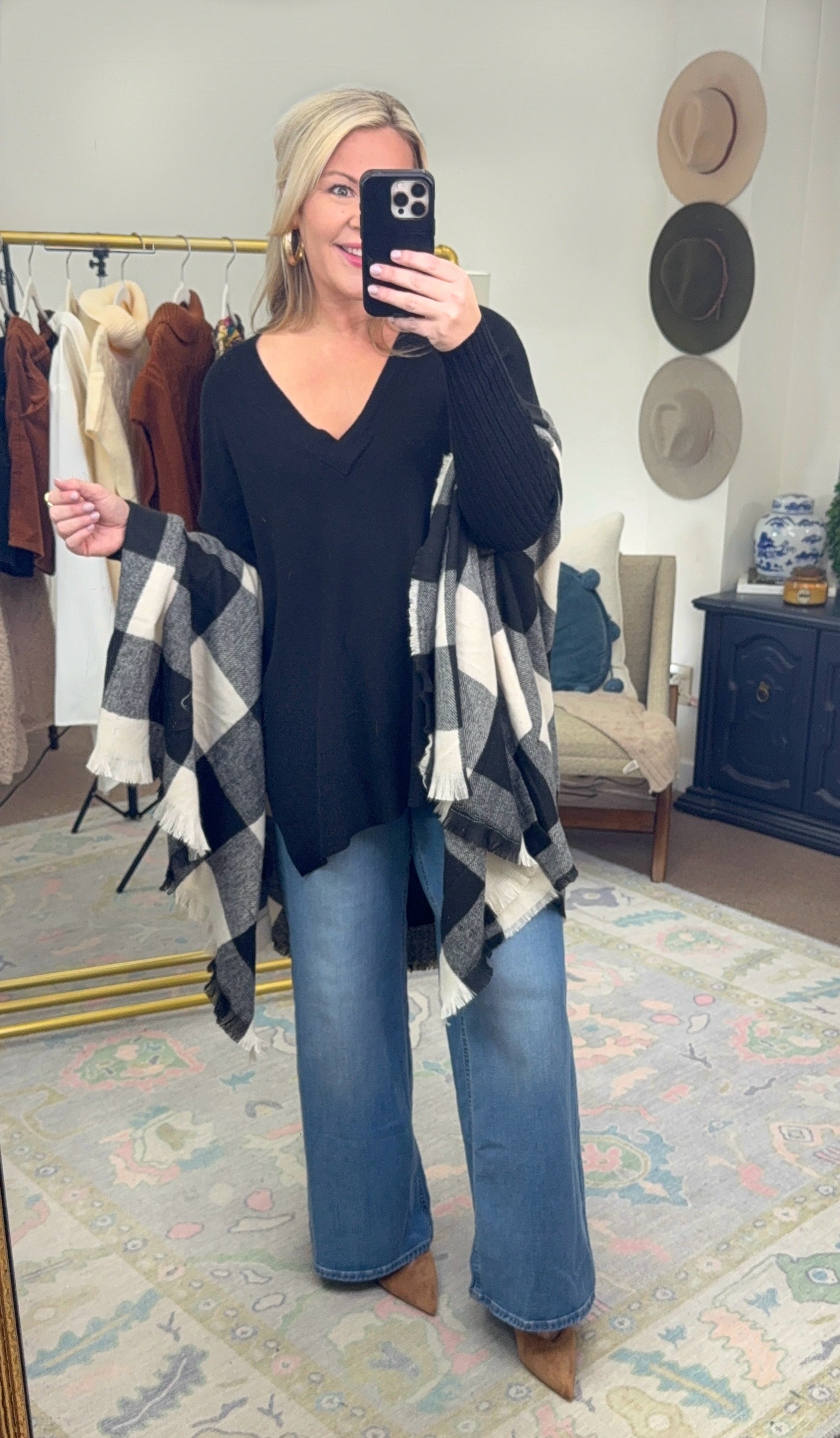There’s a reason why I style with ruanas so much in the cooler months— because they go with everything and can be dressed up OR down.